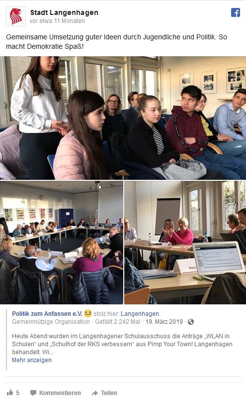 An den folgenden beiden Planspieltagen wurden sie dann von zahlreichen Ratsmitgliedern unterstützt und beraten. Auf diese Weise erlebten sie eindrucksvoll, wie Kommunalpolitik in der Realität aussieht. Auf der anderen Seite bekamen die Politikerinnen und Politiker, die sich aus verschiedenen Fraktionen des Rates der Stadt Langenhagen zusammensetzten, einen Eindruck welche Themen den Jugendlichen unserer Stadt auf dem Herzen liegen.